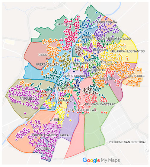 This procedure allowed the number of delivery requests in a neighborhood to be proportional to its population. Figure 5 shows the location of the random delivery points generated for the simulation. An interactive map with this information is available at: https://www.google.com/maps/d/u/0/viewer?mid=1cLBXHpdGGSUEO5mgPpU3n_5jpcUK0WpF&ll=41.62389025336443%2C-4.653338689314721&z=13.