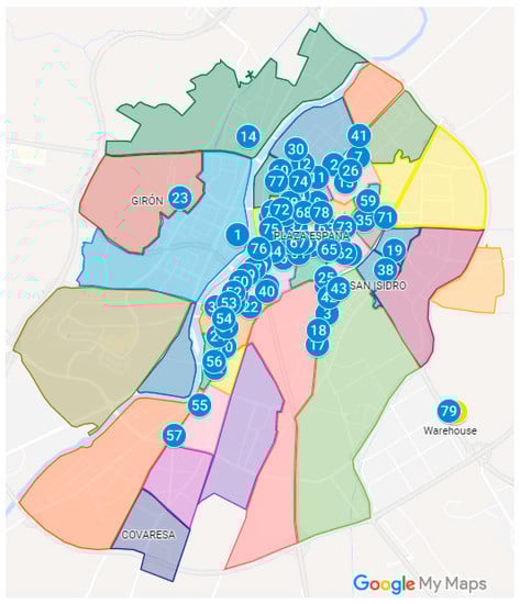 Regardless of the neighborhood to which each delivery location belonged, the 4321 daily orders were randomly allocated to one of the five couriers that currently operate in Valladolid. The number of parcels allocated to each company was made proportional to the company’s market share (Table 5).