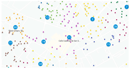 Detail of the allocation of the closest parcel locker (kiosk, blue-numbered circles) to each client (colored marks) according to the random delivery locations shown in Figure 5. The marks with the same color represent the customers who have been assigned the same kiosk. Source: Google My Maps.