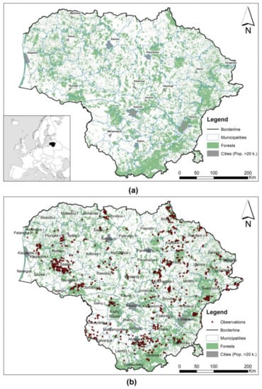 Forest cover in Lithuania, (a) inset showing country location and (b) representation of all received observations according to districts. Grayscale background indicates districts with insufficient observer coverage (0–5 reports).