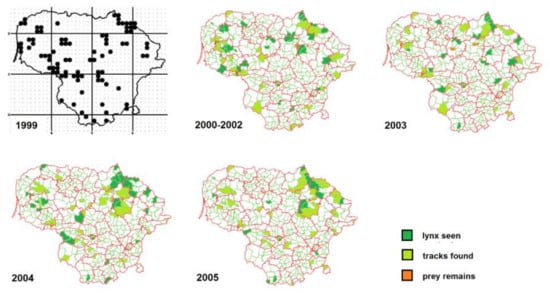 Lynx distribution in Lithuania from 1999 to 2005 based on the results of the voluntary observations. Map for 1999 is based on findings in 10 × 10-km grid cells, other maps are based on forester reports from forest districts where lynx were detected. Red lines denote boundaries of the forest enterprises, green lines show forest districts.