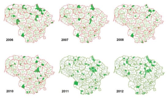 By 2006–2008, the distribution of lynx was substantially fragmented, including the core area in the northeastern part of the country (Figure 3). The number of inhabited forest districts decreased from 33 (7.7% from the total) in 2006, to 20 (4.7%) in 2007 and further to only 16 (3.7%) in 2008, being the worst years for lynx in Lithuania (χ2 = 6.46, df = 2, p < 0.05). By 2010 (25 sites, 5.9%), the range of inhabited territories started to recover. In 2011, the number of the inhabited forest districts was 41 (11.3% of the total), and 37 (10.2%) in 2012. In 2013–2015, snow-track counts were not performed or were not effective, therefore, lynx distribution was not determined. However, it seems that the population started to recover during this period. Initially, the occupied range covered northeastern to central parts of the country. A network of inhabited fragments then started to form in the southern and western parts, characterized by larger forested areas (see Figure 1a).