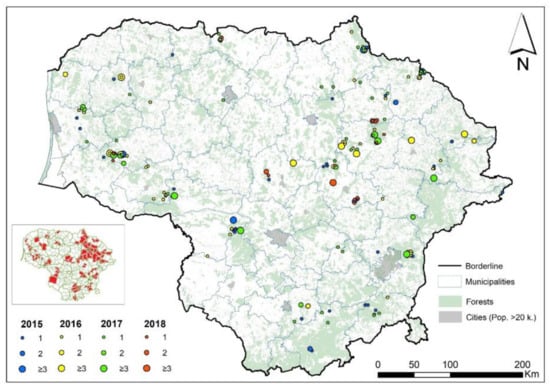 Lynx distribution in Lithuania from 2015 to 2018 based on results of volunteer observations. Inset shows lynx that inhabited forest districts. The number of registered individuals represented by circles of different size and years are denoted by color.
