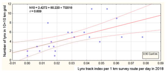 We compared the density of lynx tracks found in the winter survey of 2018 (TI, lynx track index per 1 km of survey route per one day after the last snowfall) to the number of lynx individuals registered by citizen scientists in 10 × 10-km grid squares in the same municipality (Table S1). This relationship was correlated (r = 0.61, F = 11.82, df = 1,20, p = 0.003) and well described by a linear regression (Figure 5). Based on this regression, we estimated the lynx numbers in under-sampled administrative districts. If that effort was consistent, an additional 58 individuals could have been observed (Table S1). With respect to under-represented regions where snow tracking showed lynx presence, the estimated nationwide lynx population was 162 individuals in 2018.