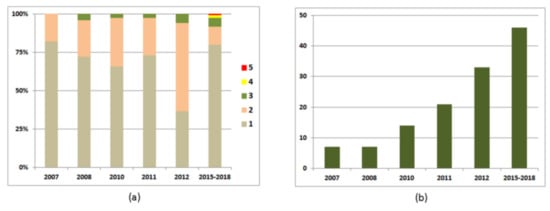 From 2007 to 2012, the proportion of single animals per observation decreased as the share of two or three individuals increased (χ2 = 26.32, df = 4, p < 0.001). Most of these observations were based on the snow-track counts. In 2015–2018, the first observations of four and five animals were reported (Figure 6a), based on direct observations, camera captures, and track counts. Increases in breeding cases were also identified. In 2007 and 2008, only seven cases were recorded in two forest areas in the very north and central part of the country (Figure 3). In 2015–2018, the number of family groups and pairs was 46 (Figure 6b), and breeding cases were registered in most of the territory investigated by citizen scientists (Figure 4).