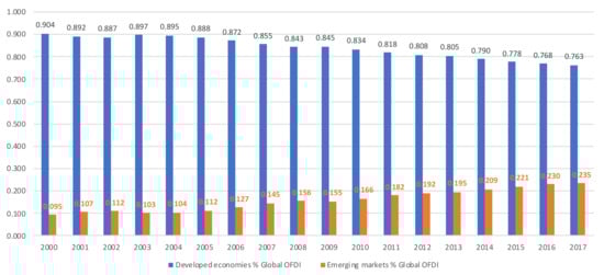 The stocks of OFDI grew dramatically in recent years, from nearly 1% of global stocks in 2000 up to 23.5% in 2017, see Figure 1. The rise of OFDI has different motivations, including the need to develop new markets, the need for a way to leverage capital and technology, as well as the need for a way to gain knowledge in international markets [,,]. Another point of view is the escape OFDI, in this case, firms look for international markets to avoid institutional misalignments or uneven conditions hindering competition in their home countries [,,].