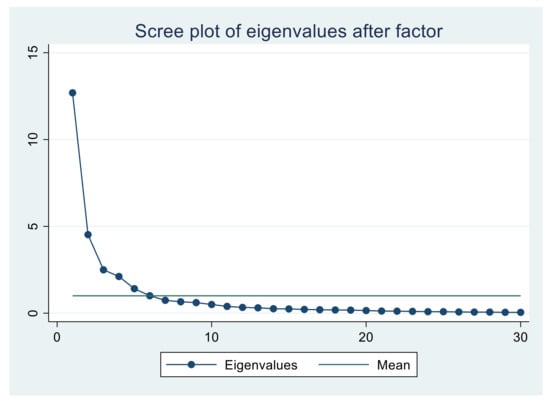 We conducted a factor analysis to determine if we can capture most of the variation between countries using a smaller number of new variables (principal-component factors), where each of these new variables is a linear combination of all or some of the 30 variables included in the original data set. To be sure that the data were suited for factor analysis, we used the Kaiser-Meyer-Olkin (KMO) measure of sampling adequacy; the result was close to 1 (see Table A3 in the Appendix A), indicating that the data are adequate for factor analysis []. Also, we specified the factor analysis method, where the commonalities are assumed to be one, and the factors are uncorrelated.