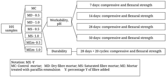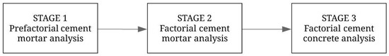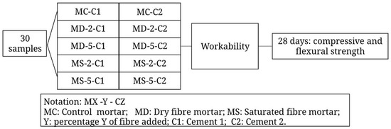 Figure 3 presents the details of the first stage. This phase consists of a pre-factorial analysis of cement mortars. The tests were performed on specimens with dimensions of 40 × 40 × 160 mm according to the Réunion Internationale des Laboratoires et Experts des Matériaux, systèmes de construction et ouvrages (RILEM) (Figure 3) [62]. The samples were made with both type of cements, estimating a compressive strength of 41 MPa and slump between 3 cm and 8 cm. These target values were chosen based on the importance of developing practical alternatives towards effectively reusing industrial waste. The amount of added fibre was 0% (control sample), 2%, and 5% with respect to the weight of cement. In addition, the fibres were incorporated in a dry and saturated state.