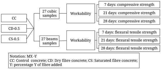 Figure 5 presents the details of the third stage. This phase consists of the factorial analysis of concrete cubic samples (200 mm) and beam samples (150 × 150 × 530 mm). Cement 1 was used in the preparation, estimating a compressive strength of 43.5 MPa and slump between 5 and 7.5 cm. The fibres were incorporated in a dry and saturated state. The fibre dosages considered were 0% (control sample) and 0.5% in relation to cement weight.