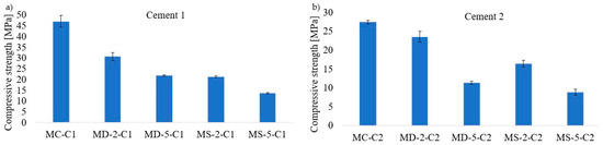 Pre-factorial cement mortar results, compressive strength: (a) Cement 1; (b) Cement 2.