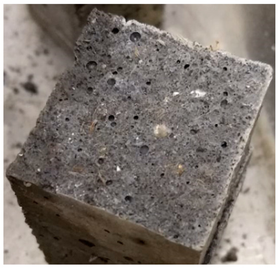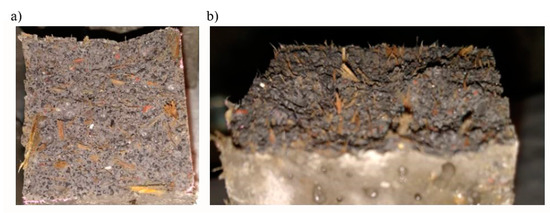 Compared to samples with 5% fibre, the results indicate that the addition of 2% fibre in dry and saturated state causes less compressive strength loss. However, in both cases, the strength reduction is significant. This behaviour agrees with the results found by other researchers working with incorporation of natural fibres into the concrete [35,37,42,43]. The strength reduction can be associated to the workability reduction, understanding that compaction is more difficult and the voids presence increases [37,43]. This situation can be clearer in the case of 5% fibre, considering the amount of workability reduction presented in Section 3.1.1. This high amount of fibres introduced in the cement mortar, and the associated workability reduction, can also produce fibres concentration due to the lack of dispersion (Figure 7). The result is a heterogeneous composite material with weak spots [35].