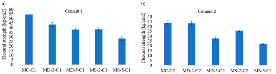 Pre-factorial cement mortar results, flexural strength: (a) Cement 1; (b) Cement 2.