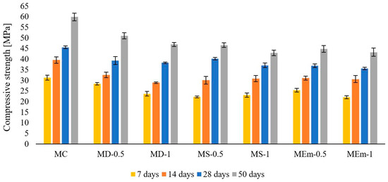 At 50 days, the best performance is presented by the MD-0.5 sample, which reaches 85% of the control sample strength. The MS-1 and MEm-1 samples show the lowest results with 72%.