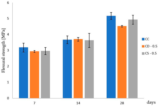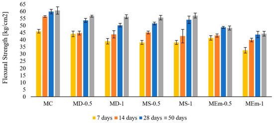 Similar to stage 1, the compressive and flexural strength of the samples was evaluated, but in this phase not only at 28 days, but also at 7, 14, and 50 days according to ASTM C 270 [64].