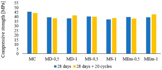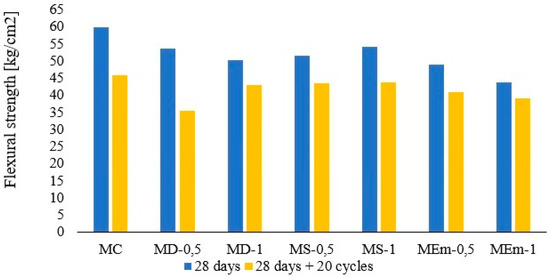 Figure 9 shows that for all ages, the greatest strength was obtained with the control sample. Regarding fibre samples, the best results at 28 days are obtained for the MS-0.5 sample, obtaining 88% of the control sample strength. This result is followed by the MD-0.5 sample with 86%. The lowest result is the MEm-1 sample with 77%.