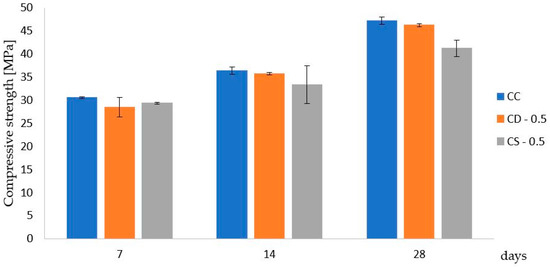 Figure 6 presents the results of the samples compressive strength with their standard error. Control samples show the best results.