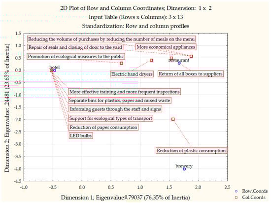 The CA method was used to better illustrate these recommendations. This method describes an association of nominal or ordinal variables to obtain a graphic representation of a relationship in multidimensional space. On the one hand, the variables are hotel, restaurant, and brewery (blue circle), and on the other, there are individual recommendations (red square). The closer the individual recommendations are to the operational part, the more the hotel’s TOP management prefers those to other recommendations. Hotel recommendations are all on the same level (LED bulbs, separate bins, more effective training, …). It is impossible to determine which recommendation is more important for the hotel and will be implemented more quickly in practice. In reality, the hotel must decide which recommendations are most cost-effective. In the case of the restaurant, the recommendations regarding returning all boxes to suppliers seem to be the most important. As a recommendation for the brewery, CA results in reducing plastic consumption (