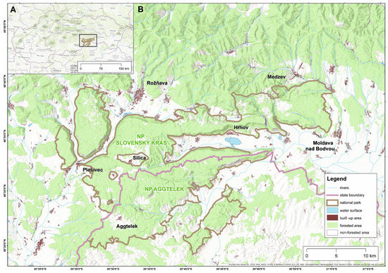 Location of Slovak Karst National Park (NP) (NP Slovenský kras) and its position in Slovakia. (A) Location of the Slovak Karst National Park within Slovakia, (B) The Slovak Karst National Park boundary.