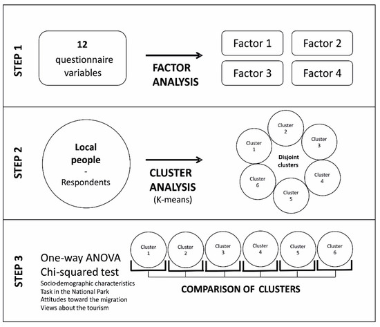 Figure 2 highlights the conceptual framework of the study. First, attitude factors were generated by factor analysis, and clusters of local people were created by cluster analysis. Second, we characterized the clusters by using the factor loadings of different attitudes in each cluster. Finally, we compared the clusters by one-way analysis of variance (ANOVA) and Chi-squared tests. As a result, we gained a complex image of local behavioural characteristics, which can be used for the refinement of future NP development strategies.