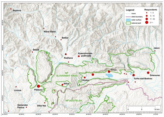 Figure 3 shows the spatial distribution of the local respondents who took part in the survey. They were from 30 municipalities in and around the Slovak Karst territory. Over half of the respondents resided in the relatively larger Plešivec, Hrhov, Turňa nad Bodvou, Drienovec and Jablonov nad Turňou settlements with more than 800 inhabitants. Half the respondents were selected from smaller municipalities evenly distributed throughout the study site, and this combination ensured relevance and a representative population in each category from the size structure of the studied settlements.