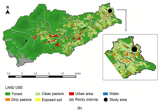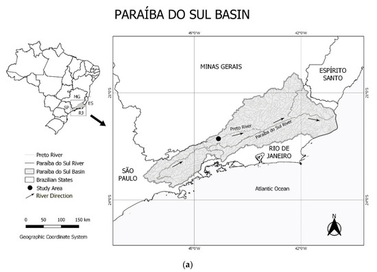 The study area is located in the Atlantic Forest biome, which has a high biodiversity but also many endangered species. Some parts of the Visconde de Mauá are inside the environmental protection area of Serra da Mantiqueira and the Itatiaia National Park. The local vegetation is a mix of tropical forest and mountain forests [39]. In general, the Preto river basin suffers impacts related to agricultural and livestock activities (Figure 1b) as well as urban expansion [36].