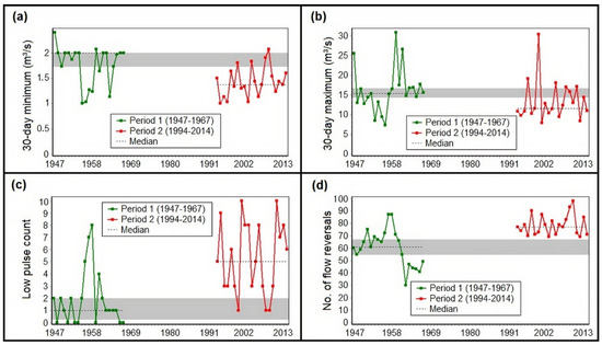 Some indicators of hydrologic alteration (IHA) along with period 1 (1947–1967) and period 2 (1994–2014), which show high levels of alteration via RVA analyses: (a) the minimum annual flow of 30; (b) maximum annual flows of 30 days; (c) low pulse count; (d) the number of flow reversals. The area in dark grey indicates the target range of the RVA method.