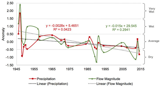 From 1945 to 2015, the annual discharge and precipitation anomalies changed from the wet category to an average category and presented a similar linear tendency (Figure 3). However, the tendency lines suggest a reduction in the anomaly’s values faster for flow magnitude than precipitation. The flow magnitude anomaly behavior does not follow the precipitation anomaly in 1951, 1957, 1994, 2004, and 2012.