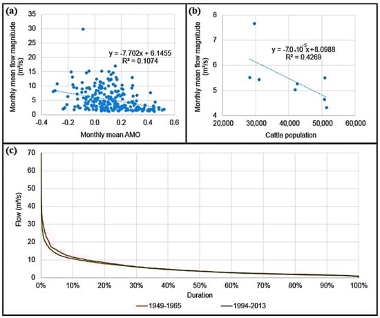 (a) Linear regression between the monthly mean AMO and monthly mean flow magnitude, (b) linear regression between the cattle population and monthly mean flow magnitude, and (c) flow magnitude duration curves for the average category for 1949 to 1965 (period 1) and 1994 to 2013 (period 2).