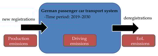 As effects that extend beyond the national borders are subject to large uncertainties, the system boundary is drawn around Germany. After deregistration from the German transport system, only the EoL (decommissioning) emissions and no further driving performances will be accounted for in the life-cycle analysis, as shown in Figure 1.