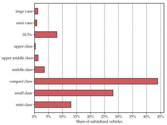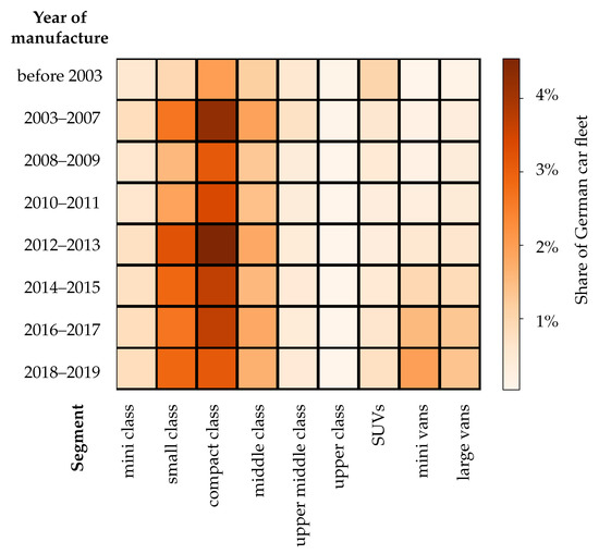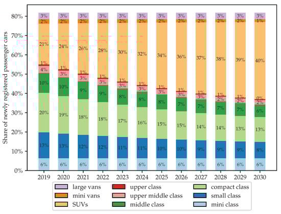 Additionally, an estimation concerning the segments was created based on the trend of the new registration numbers from previous years. For the large van, mini van, upper class, and upper middle class segments, we assumed that the share of new registrations remains constant. In addition, we assumed that the new registration share of segments not considered in this analysis will stay constant, which results in a non-varying share of the overall scope of 82%. A noticeable growth of the sport utility vehicle (SUV) segment has been observed over the last years [21]. The vehicle segment development is visualized in Figure 4.