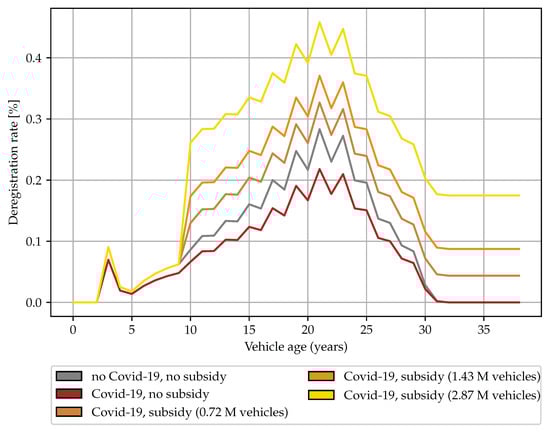 In the next step, the modified scenarios (shown in Figure 6) are derived from the baseline by adapting the deregistrations only. First, the deregistration rate is decreased to reflect the reduced registrations due to owners’ financial uncertainty during the COVID-19 pandemic. The total vehicle registrations in 2020 are decreased by 23% compared to 2019 [1]. To simulate a subsidy in 2021, the deregistration of vehicles older than 10 years is increased to match the total number of subsidized vehicles. For the baseline scenario, this number is set to the predicted new registration decrease due to the COVID-19 pandemic (0.72 million). In Section 4.4, we discuss the impact of the number of subsidized cars; therefore, additional analyses of twice and four times the baseline amount (1.43 and 2.87 million) were made.