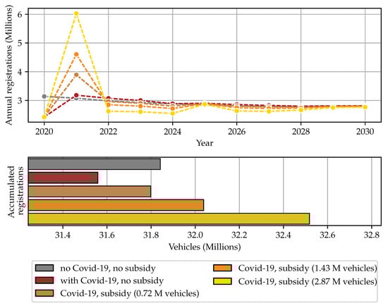 Figure 7 shows the annual and the accumulated vehicle registrations for different scenarios. The economic uncertainty due to the COVID-19 pandemic reduces the total number of vehicle registrations by forcing owners to keep their vehicles longer. On the contrary, the subsidy leads to earlier replacements and, therefore, increases the new registrations. As already explained for Figure 5, there is a first peak of vehicle decommissioning after three years.