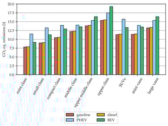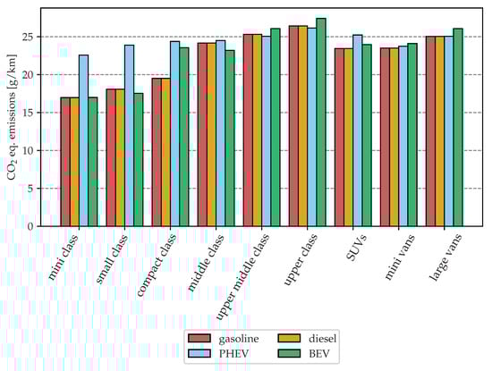 For the remaining electric vehicles, the process passenger car production, electric, without battery [34] was used with the remaining curb weight from Table 3.