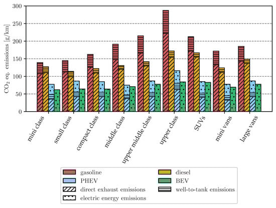 In order to analyze the life-cycle emissions of the drive train technologies per segment, specific input data (weight, direct CO2 emissions, fuel, and electric energy consumption) are needed. Complete data for gasoline and diesel vehicles are available. For PHEVs and BEVs, the required input is derived from defined reference vehicles. Currently, in some segments, there are no vehicles available. In these cases, input data are interpolated from adjacent segments.