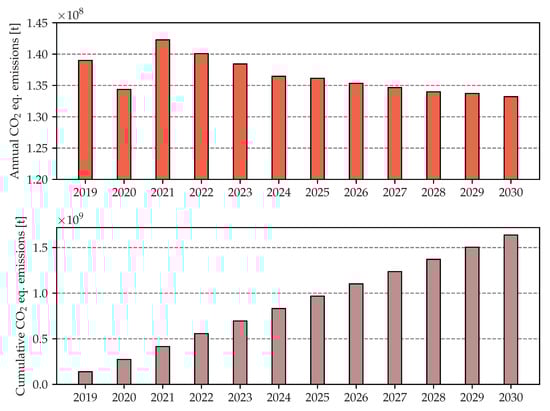 In 2019, the average annual mileage of passenger cars was 13,602 km [43]. In this model, it is assumed that, in the future, every car will have the 2019 average annual mileage.