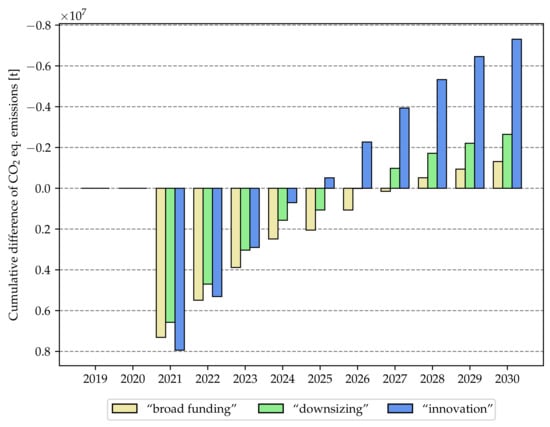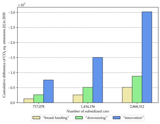Considering the time period 2019–2030 and a total number of 0.72 million subsidized vehicles, the “innovation” concept generates about 7.56 million t less CO2 eq. emissions compared to the scenario without a subsidy. This equates to 0.46% of the total CO2 eq. emissions of the addressed segments in this period. The “downsizing” and “broad funding” concepts create savings of 0.16% and 0.08%, respectively.