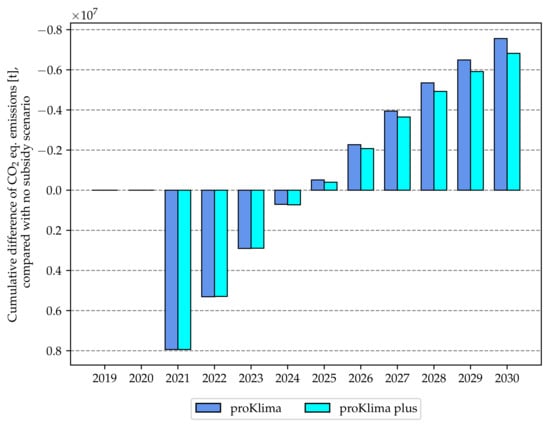 Cumulative CO2 eq. emission difference between the “no subsidy” baseline and the “innovation” concept using the “proKlima” and “proKlima Plus” registration predictions.