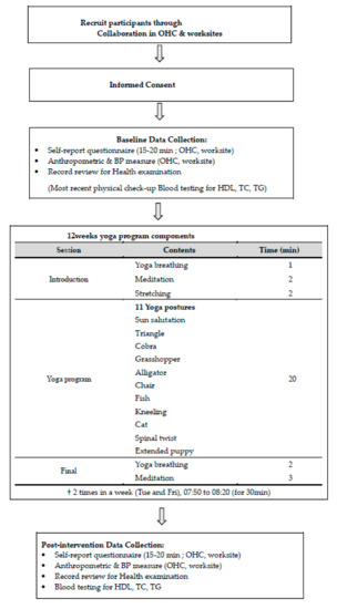 In previous studies, when applied to various participants from children to the elderly [22,23,24,25], yoga has been reported to reduce anxiety and depression in hospitalized patients with mental health disorders [22], reduce middle-aged women’s stress, cortisol, glucose, resting heart rate, diastolic blood pressure, and mean arterial blood pressure [23], reduce fatigue, pain, stress, and anxiety in patients with multiple sclerosis [24], reduce autonomic nerves, salivary cortisol, immunoglobulin A, and stress index in elementary school students [26], and reduce blood pressure and cholesterol in the elderly with essential hypertension [27]. Meanwhile, studies that have tested the effects of yoga on workers found that yoga lowers job stress, psychological stress, and anxiety in office workers [28], lowers stress responses in professional workers [29], improves physical functions and pain in menopausal female workers [30], promotes weight loss in wellness center workers, lowers diastolic blood pressure, improves range of motion, decreases body fat, and improves quality of life [31]. However, there has been no study that investigated the effects of yoga in reducing CVD risks including psychological factors in workers of small enterprises. The purpose of this study was to investigate the effects of a yoga program to reduce CVD risk factors including psychological factors such as job stress and depression provided to workers in small enterprises.