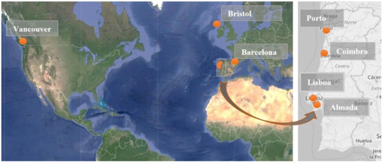 Overall, the cities’ areas vary between 41 and 110 km2. Regarding the urbanized areas, involved cities range from dense and compact settlement to less consolidated. In essence, involved cities present different population contexts, from high densely populated cities, such as Barcelona (with a population density of 15,873 hab./km2), to more intermediate populated ones, like Lisbon and Vancouver (with a population density of 6446 and 5493 hab./km2, respectively).