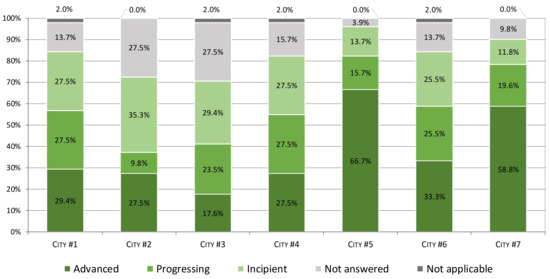 The resilience maturity and the available information in the cities are analyzed in this section. Figure 2 presents the overall metrics’ results of the essential analysis degree for the cities, identifying the resilience development level. The overall RAF metrics’ results correspond to the percentage of metrics within incipient, progressing, and advanced levels obtained for every city through the application of the RAF essential analysis degree. Moreover, the pecentages of not answered and not applicable metrics are also detailed.