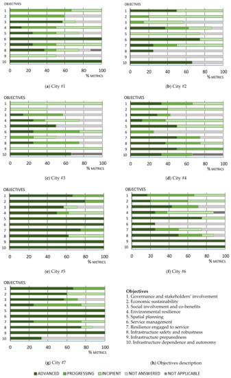 In this sense, the cities can be aggregated into two main groups, in function of the resilience maturity and available information. Group I considers the cities with a lower (#1, #2, #3, #4, and #6) and Group II involves the higher (#5 and #7) percentage of metrics with advanced resilience development level.