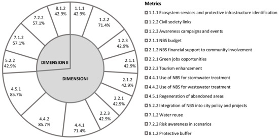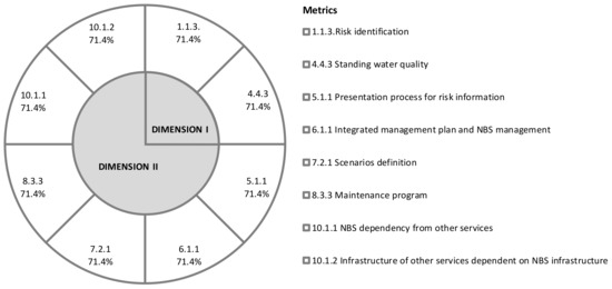 In Dimension II, the main consolidated aspects correspond to the Risk identification (1.1.3) and the Standing water quality (4.4.3) metrics. Regarding Dimension II, the main consolidated aspects are Presentation process for risk information (5.1.1), Integrated management plan and NBS management (6.1.1), the Scenarios definition (7.1.2), the program (8.3.3), NBS dependency from other services (10.1.1), and Infrastructure of other services dependent on NBS infrastructure (10.1.2).