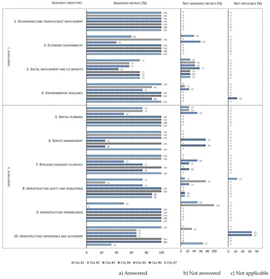 Figure 6. Percentage of the (a) answered, (b) not answered, and (c) not applicable metrics by cities, aggregated for each resilience objective.