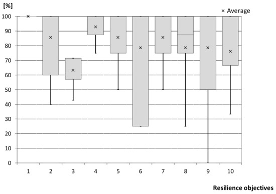 All relevant NBS aspects identified in a previous literature review have been considered in the RAF through the assessment criteria and, more aggregately, the resilience objectives. In this section, the NBS aspects assessed by the cities are analyzed based on the answered metrics for every resilience objective. This analysis allows us to identify the main difficulties in NBS aspects assessment regarding the essential analysis degree. Figure 7 presents the summary of the answered metrics for the resilience objectives by the cities, based on the application of the RAF essential analysis degree. In the box plots, the bottom and top of the box correspond to the percentile 25 and 75, respectively.