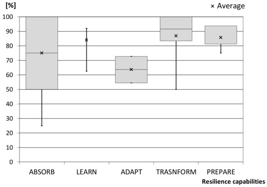 The consideration of all resilience capabilities (e.g., absorb, learn) represent an important requirement in the RAF. The essential analysis degree proposes a set of 51 metrics to assess all resilience capabilities, namely, (i) four absorb metrics (8.2%), (ii) eight learn metrics (16.3%), (iii) 11 adapt metrics (22.4%), (iv) 12 transform metrics (24.5%), and (v) 16 prepare metrics (32.7%). Figure 8 presents the summary of the answered metrics for the resilience capabilities by the cities, based on the application of the RAF essential analysis degree. In the box plots, the bottom and top of the box correspond to the percentile 25 and 75, respectively.