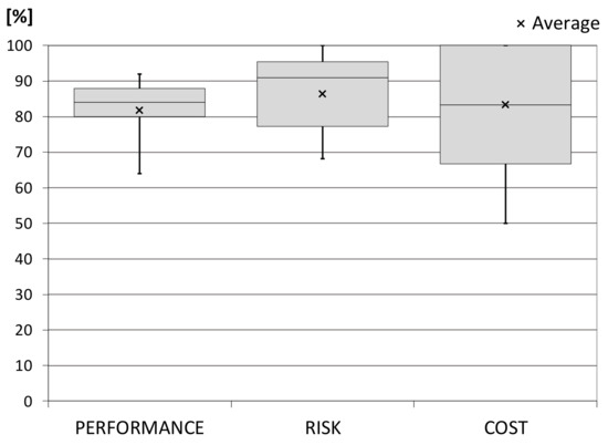 Figure 9. Box-plots for the performance, risk, and cost answered metrics, based on the application of the RAF essential analysis degree.
