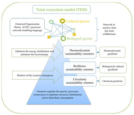 The sustainability related concepts and models reached a certain maturity and offer the opportunity for setting a sound theoretical ground for reconciliation and operationalization. Some of the major methods and tools (e.g., CBS/MCS, essential capitals, LCA) subscribe to the TBL framework, which dominates the theoretical landscape, while others belong to the ecological footprint family (e.g., the SPI). Concepts like resilience and circularity became influential, and the literature confirms their closeness degree to the core sustainability conceptualization, although originating from different perspectives (theoretical ecology versus economy). Theoretical ecology joins the orientation theory of viable and sustainable systems, providing a conceptual model based on self-organization gradients or goal functions (e.g., fitness functions, thermodynamic orientors). The COT defines the “organization” concept and a reaction networks language which can provide a higher abstraction level for ecological and socio-economic processes and entities, a formalism for sustainability orientors (and their computation) and the algorithms for generic and specific sustainability patterns identification in a reactions network. The sustainability problematization revealed the motifs of a possible model of ecological networks inspiration, the “total ecosystem”, which immerses the anthropic cultural (social-economic) system in a web of cascading relations between entities (represented as processes sources and sinks) of biological or cultural species, being constrained by thermodynamic, chemical, biological, and cultural gradients. The total ecosystems’ sustainable reactive states are essentially determined by the mutual regulation between these four gradient types and the three categories of ecological extremal principles: Resilience (linked to biological and cultural gradients), circularity (linked to chemical gradients), and thermodynamic orientors (linked to energy gradients). Future developments of the total ecosystem model concern the completion of operational deployment sequences producing outcomes easy to use by the SESs’ management research and practice, such as the computation of sustainable regimes by changing values of the system’s parameters.