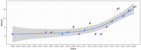 The present study identified 95 documents published between 1998 and 2020, with an 18.92% annual production rate (13.43% excluding early access publications). The highest number of publications are concentrated in the period 2017–2020 (n = 56, 58.95%), although the scientific production of 2020 could be incomplete since data collection was conducted in October 2020. Despite the fluctuation of publications throughout the years, Price’s model of scientific growth is confirmed in this study. According to Price [36], scientific production grows exponentially in a way that in a 10–15-year period, it can duplicate. This tendency is confirmed in our study, with a total of 13 documents published before 2010 and 82 publications between 2010 and 2020. Figure 2 displays the evolution of the scientific production and the growth tendencies curve.