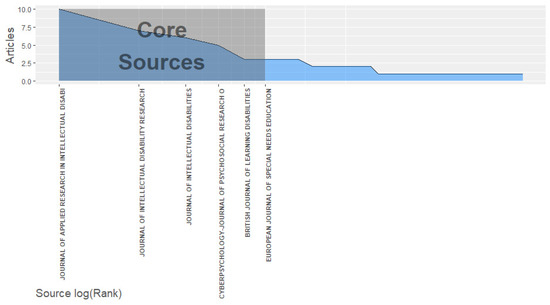 The number of articles per source displayed in Table 1 confirms Bradford’s law. According to this law, the distribution of scientific production related to a specific subject is highly unequal, with a small number of sources concentrating a large number of publications, while a large group of sources has a similar number of publications [37,38]. Figure 3 shows that the core sources with the highest number of publications referring to the Internet and intellectual disability were five, representing 8.9% of the whole sample of sources analyzed. Along with the aforementioned journals, Cyberpsychology, British Journal of Learning Disabilities, and European Journal of Special Needs Education must be considered.