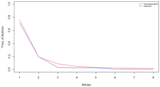 Likewise, the authors’ scientific production was analyzed using Lotka’s coefficient estimation [40]. According to this principle, the distribution of authors’ productivity is unequal, with a low number of authors making a greater contribution to the field, while the majority of the authors publish a single article. The findings show an estimated β coefficient of 2.48 with a goodness fit of 0.94. The results of the Kolmogorov-Smirnov test for two samples show a p-value = 0.93. Therefore, no statistically significant differences were found between Lotka’s theoretical distribution and the observed distribution (Figure 4), confirming Lotka’s law that states that very few authors have contributed to a greater number of publications, while the majority are single-publication authors.